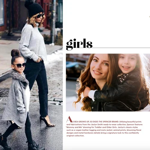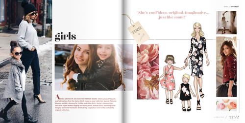 Utilizing beautiful prints and fabrications from the Jaclyn Smith ready-to-wear collection, Spencer features "Mini Me" dressing for Toddler and Older Girls. Jaclyn’s classic styles such as a vegan leather legging and moto jacket, animal prints, blooming fl oral designs, and metal hardware details bring a signature look to this confidently original collection.
